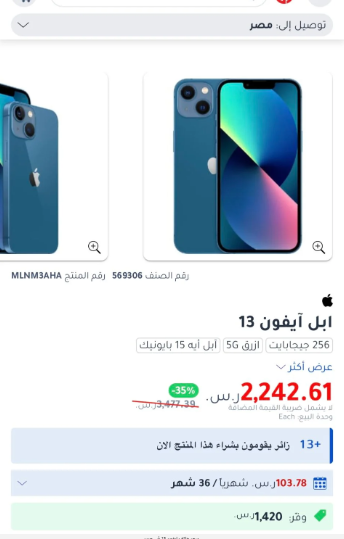 طرحت مكتبة جرير عرض خاص على هاتف iPhone 13، اللون الأزرق، بسعة 256 جيجابايت وذاكرة عشوائية 4 جيجابايت، بتخفيض من 3,477 ريال إلى 2,242 ريال فقط، مما يعني توفير 1,420 ريال على هذا الإصدار الفاخر، تتضمن المزايا الإضافية التي تقدمها جرير: