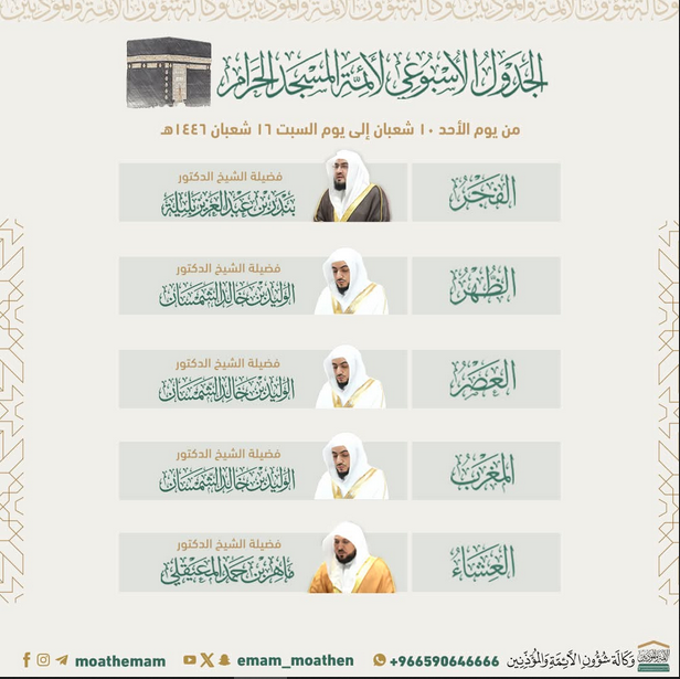 يظهر جدول الأئمة لهذا الأسبوع حرص وزارة الشؤون الإسلامية على تقديم أفضل تجربة للمصلين في الحرم المكي.
