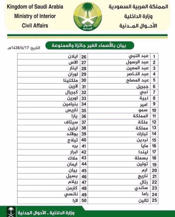 نماذج لأسماء محظورة في المملكة لعام 1447 هـ