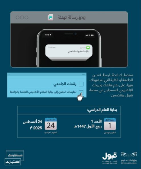 ضمن الإجراءات الجديدة، أوضحت منصة "قبول" أن الجامعات والكليات المعنية ستقوم بإرسال رسائل نصية قصيرة SMS إلى أرقام الهواتف التي تم تسجيلها مسبقا من قبل الطلبة في النظام الإلكتروني الخاص بالقبول.