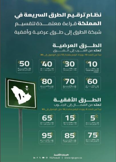 تتبنى الهيئة العامة للطرق في المملكة العربية السعودية نظام متطور لترقيم الطرق السريعة، يقوم على أسس هندسية وتنظيمية دقيقة، تهدف إلى تحقيق أعلى مستويات الكفاءة في إدارة شبكة الطرق الوطنية.