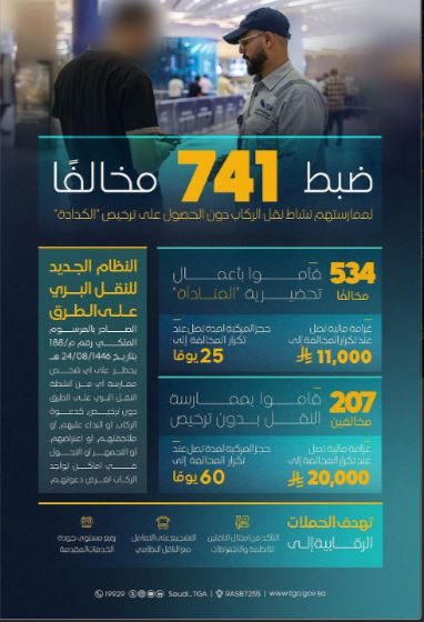 وفي هذا السياق، واصلت الفرق الرقابية التابعة للهيئة جولاتها الميدانية المكثفة في مختلف مناطق المملكة، حيث تمكنت خلال الفترة الممتدة من السبت 18 أكتوبر حتى الجمعة 24 من الشهر نفسه من ضبط 741 مخالف تورطوا في ممارسة نشاط نقل الركاب المعروف باسم "الكدادة" دون الحصول على تراخيص نظامية تخولهم القيام بذلك.